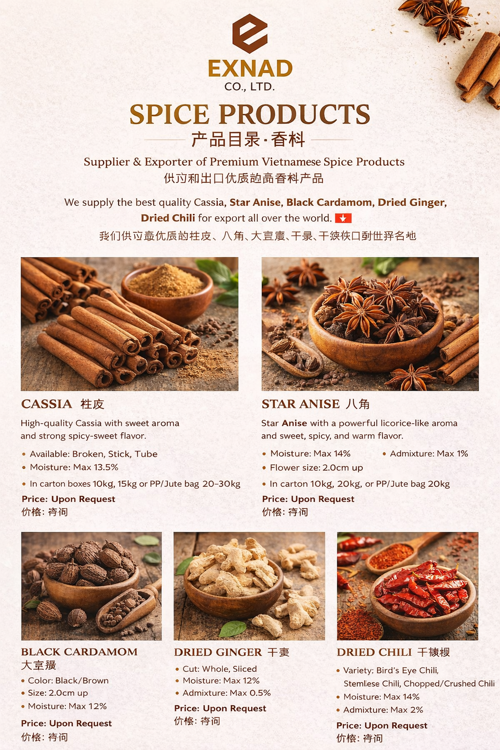EXNAD CO., LTD is a Vietnam-based company with many years of experience in sourcing, processing, and exporting cinnamon to international markets. With a strong commitment to quality and sustainable development, we have built a solid reputation as a reliable supplier of Vietnamese cinnamon.