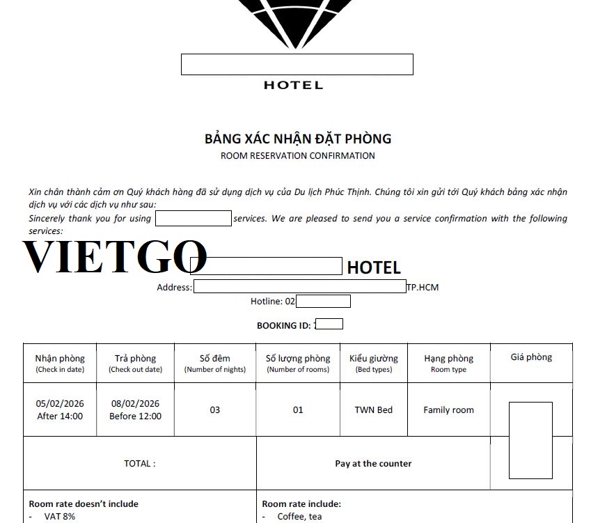 - Vào 14h00p chiều ngày 5/2/2026, vị khách sẽ nhận phòng tại khách sạn ██████████.