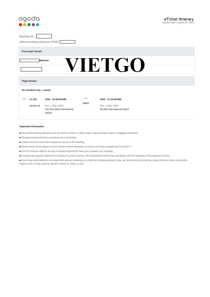 - Ông Mahesar sẽ có chuyến bay từ Hồ Chí Minh tới Hà Nội vào lúc 15:00 ngày 01/09/2024.