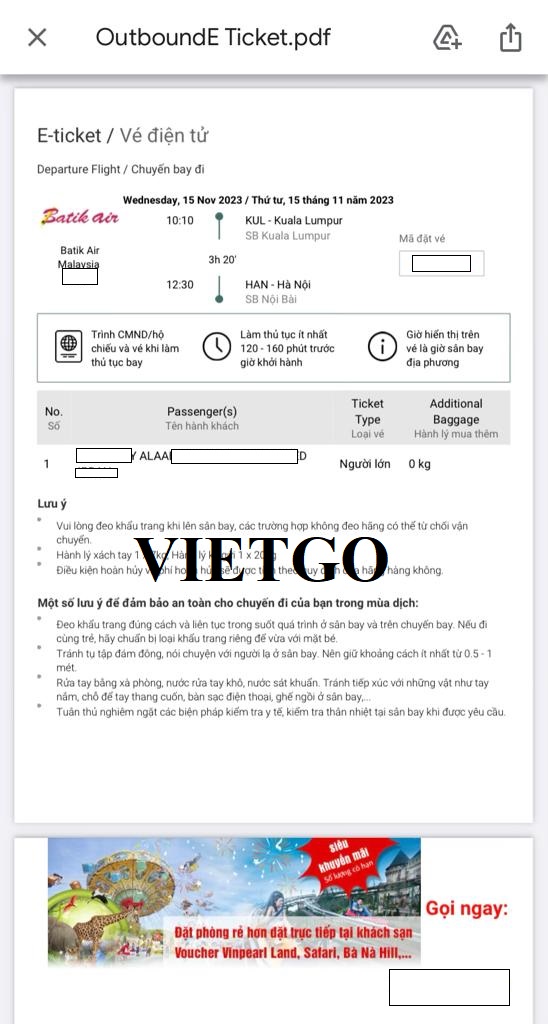 Hình ảnh thông tin vé máy bay của vị khách hàng