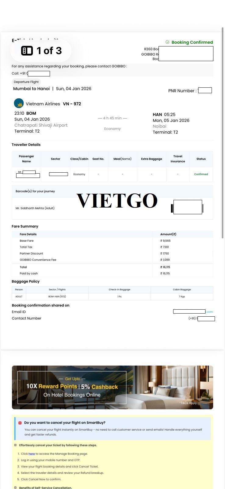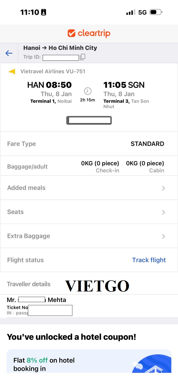 Hình ảnh thông tin vé máy bay của ông Mehta