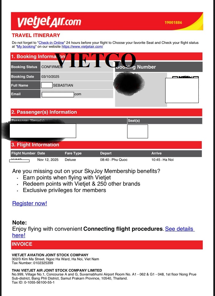 Hình ảnh thông tin vé máy bay của vị khách hàng