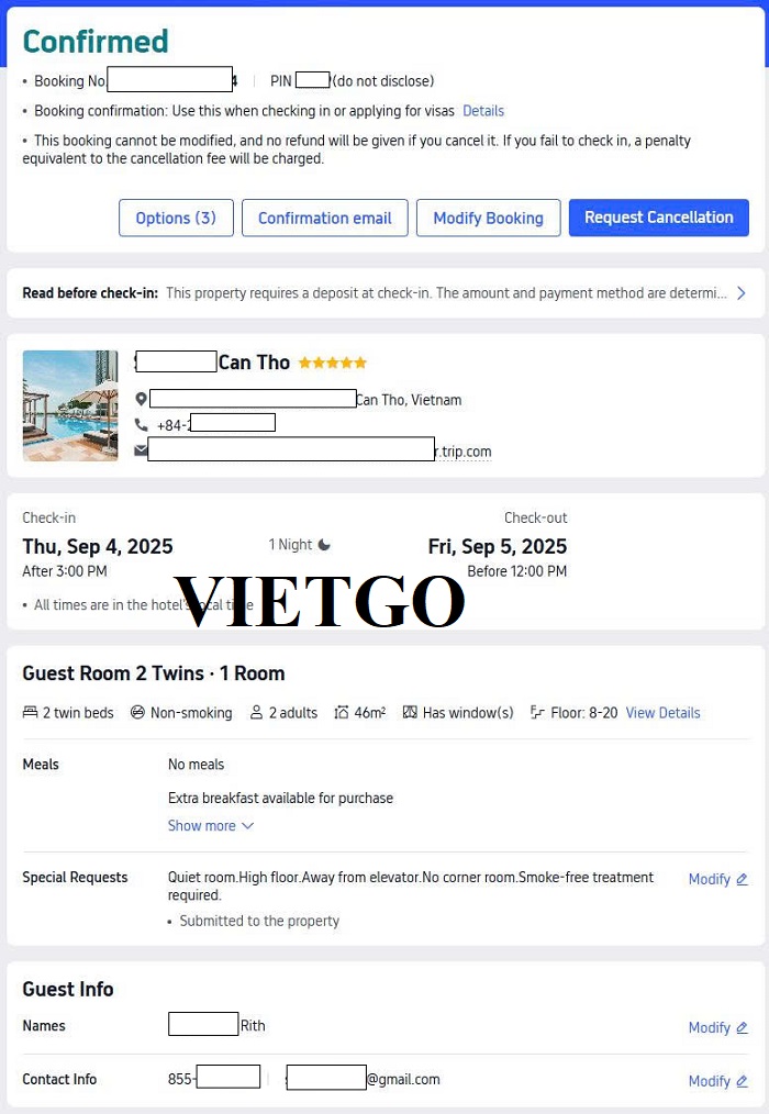 Hình ảnh thông tin đặt phòng khách sạn của vị khách hàng tại Cần Thơ ngày 04/09/2025