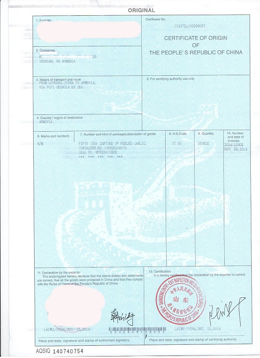 Chúng tôi nhập khẩu một số sản phẩm dùng để chế biến thịt (tỏi, tiêu, ớt…) từ nhiều nước trên thế giới như Trung Quốc, Brazil, Argentina, Mỹ,… Đây là CO (giấy chứng nhận xuất xứ hàng hóa) một lô hàng nhập khẩu tỏi của công ty chúng tôi từ Trung Quốc:
