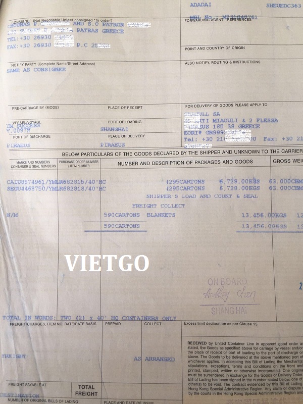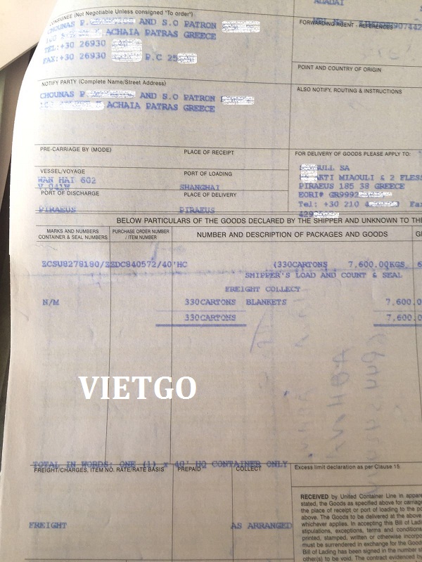 Qua những thương vụ trước, VIETGO đã từng xúc tiến cho ông Chounas và nhận thấy công ty của ông là đối tác rất tiềm năng. VIETGO đưa ra B/L nhập khẩu chăn từ Trung Quốc của ông để quý vị yên tâm đây là khách hàng đã từng nhập khẩu nhiều lần, khách hàng thật chứ không phải người mới hỏi mua lần đầu.