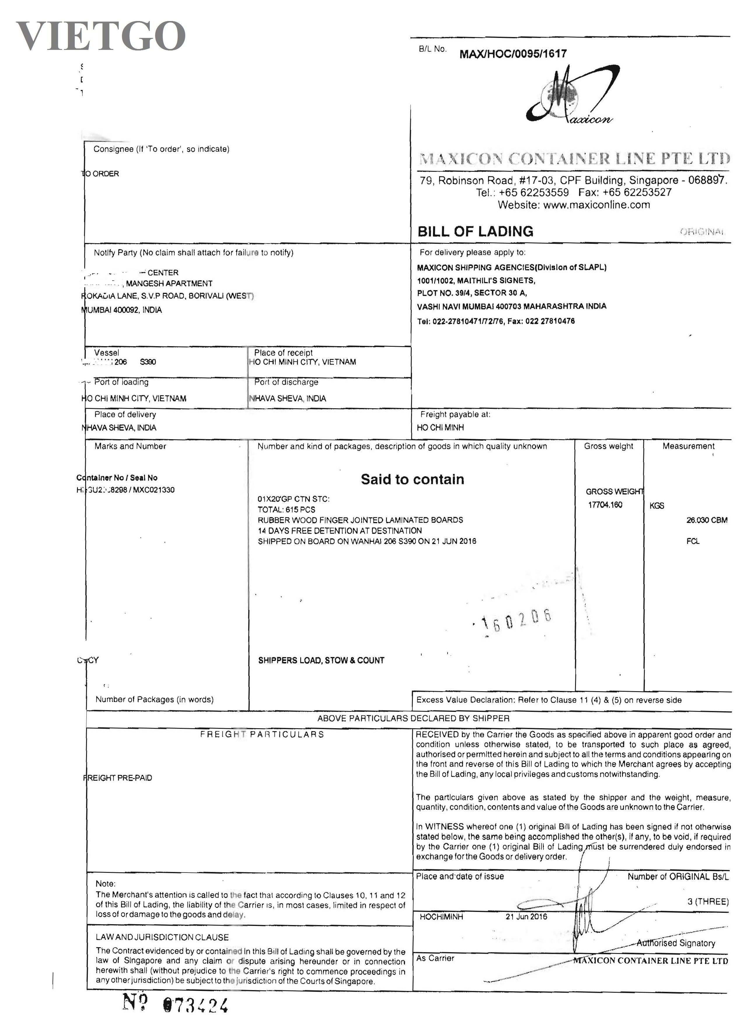 Qua những thương vụ trước, VIETGO đã từng xúc tiến cho ông Murli Watwani và nhận thấy công ty của ông là đối tác rất tiềm năng. VIETGO đưa ra B/L nhập khẩu gỗ ghép thanh tại TP.Hồ Chí Minh của công ty ông để quý vị yên tâm đây là khách hàng đã từng nhập khẩu nhiều lần, khách hàng thật chứ không phải người mới hỏi mua lần đầu.