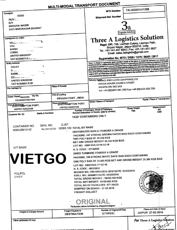 Qua những thương vụ trước, VIETGO nhận thấy công ty của bà ██████████ là đối tác rất tiềm năng. VIETGO đưa ra B/L vạ̀ giấy tờ nhập khẩu bột nghệ từ Ấn Độ của công ty bà để quý vị yên tâm đây là khách hàng đã từng nhập khẩu nhiều lần, khách hàng thật chứ không phải người mới hỏi mua lần đầu