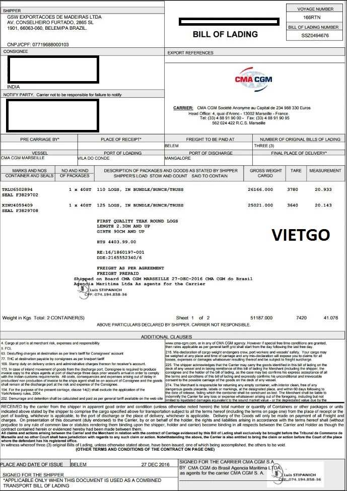 Qua những thương vụ trước, VIETGO đã từng xúc tiến cho ông Karthik và nhận thấy công ty của ông là đối tác rất tiềm năng. VIETGO đưa ra B/L nhập khẩu gỗ teak tròn của ông để quý vị yên tâm đây là khách hàng đã từng nhập khẩu nhiều lần, khách hàng thật chứ không phải người mới hỏi mua lần đầu.