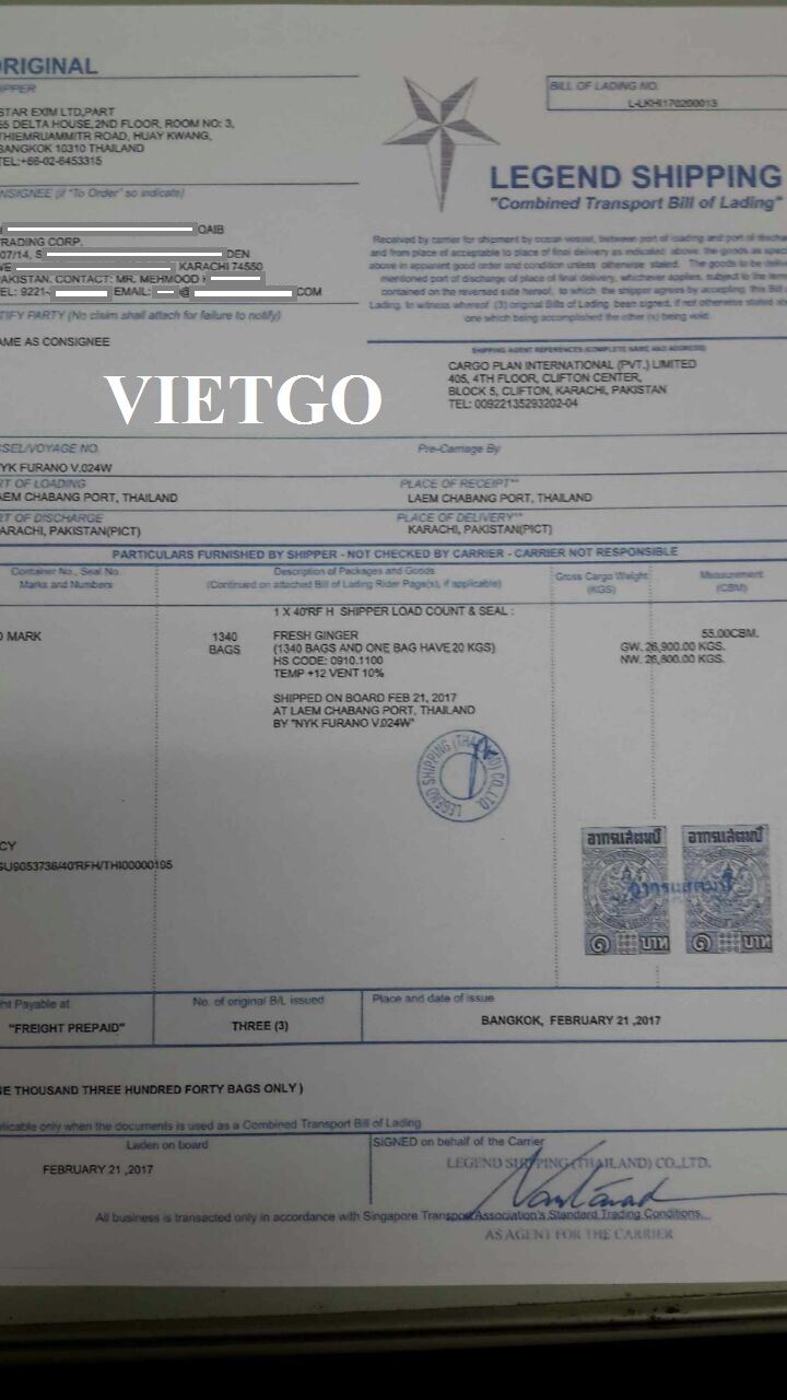 Qua những thương vụ trước, VIETGO đã từng xúc tiến cho ông Moodi và nhận thấy công ty của ông là đối tác rất tiềm năng. VIETGO đưa ra B/L nhập khẩu gừng của ông để quý vị yên tâm đây là khách hàng đã từng nhập khẩu nhiều lần, khách hàng thật chứ không phải người mới hỏi mua lần đầu