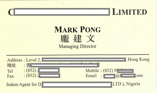 Tôi là Mark Pong, đại diện công ty C██████████ Ltd. Tôi đến từ Hong Kong.