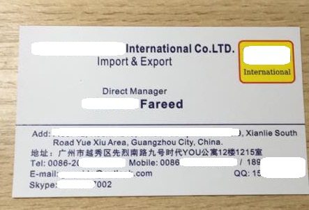 Tôi là Yang, đại diện Công ty ██████████International Co LTD, có trụ sở tại Quảng Châu, Trung Quốc. Chúng tôi là công ty thương mại. Giám đốc của chúng tôi là ngườ Iraq.