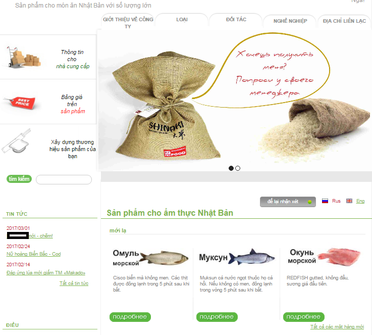 Công ty chúng tôi là nhà phân phối các sản phẩm nông sản và lương thực có nguồn gốc từ Nhật Bản tại thị trường Nga như rong biển, các loại mì ramen, udon; nước tương, gạo và nhiều sản phẩm đặc trưng của Nhật khác.