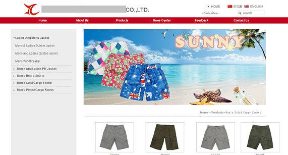Tôi có 1 công ty chuyên cung cấp các sản phẩm may mặc tại Trung Quốc là ██████████ Co. Sản phẩm chủ yếu của chúng tôi là Áo khoác nam, nữ và quần short nam.