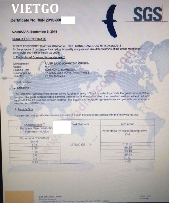 VIETGO xin gửi tới Quý vị Bill of lading và chứng chỉ SGS mặt hàng cát xây dựng mà Công ty ██████████ Trading đã đại diện xuất khẩu thành công từ Campuchia sang Ấn Độ để Quý vị yên tâm Ông Arul là người đã có kinh nghiệm mua hàng, chứ không phải mới hỏi mua lần đầu