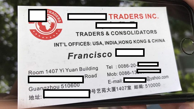Tôi tên là Francisco ██████████, đại diện công ty ██████████ Traders Inc của Mỹ có trụ sở tại Quảng Châu, Hongkong, Ấn Độ và Mỹ. Chúng tôi làm kinh doanh thương mại.