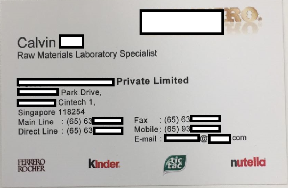 Ông Calvin ██████████ đại diện công ty bánh kẹo mang tên ████████████████████ Private Limited tại Singapore. Một vài sản phẩm của công ty ông là sô-cô-la Rocher và mứt hạt phỉ để phết bánh mì(nutella).