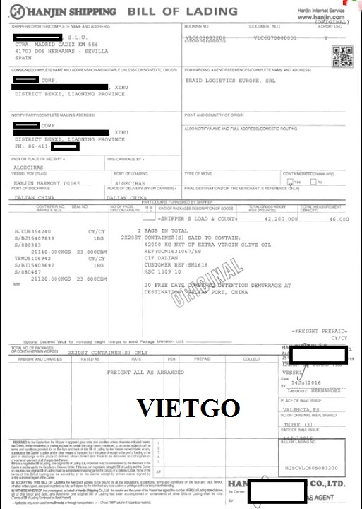 ██████████ Corporation là công ty có 8 năm kinh nghiệm trong lĩnh vực các loại dầu thực vật và năm vừa rồi có nhập khẩu 1.200 tấn dầu ô-liu từ Tây Ban Nha. Quý vị có thể tham khảo chứng từ vận đơn đường biển của đơn hàng này như bên dưới: