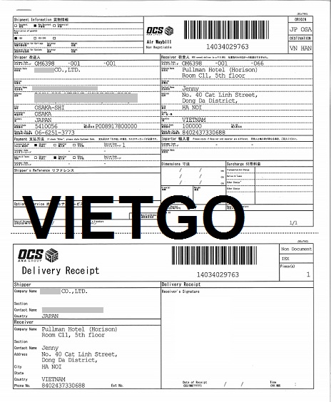 Hóa đơn chuyển phát nhanh từ OCS Nhật Bản gửi đến văn phòng VIETGO tại Pullman