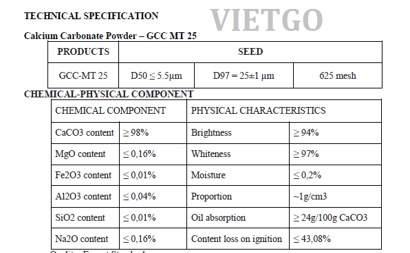 1) Kích thước hạt: 625 Mesh, Số lượng: 1000 tấn