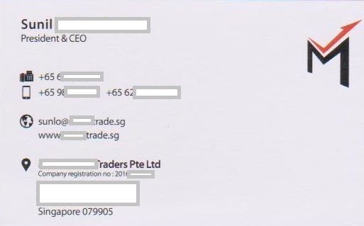 Tôi tên là Sunny đến từ Công ty ██████████ Traders Pte Ltd có văn phòng tại Singapore. Chúng tôi kinh doanh số lượng lớn các loại mặt hàng (bao gồm cả xuất khẩu và nhập khẩu)