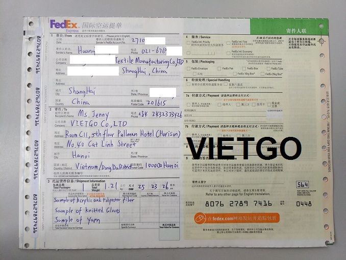 Tôi đã gửi mẫu găng tay đến văn phòng VIETGO tại Hà Nội để quý vị có thể tham khảo. Đây là hóa đơn chuyển phát nhanh của chúng tôi từ Văn phòng tại Thượng Hải.