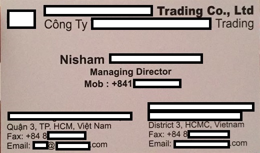 Ông Nisham ██████████ là người Ấn Độ nhưng hiện đang sống và làm việc ở Việt Nam được 13 tháng. Ông có một công ty kinh doanh thương mại ở thành phố Hồ Chí Minh có tên ████████████████████ Co., LTD. Khách hàng của ông thường đến từ khu vực Trung Đông(Dubai, Bahrain, Qatar, Ả Rập, Oman, Ấn Độ…)