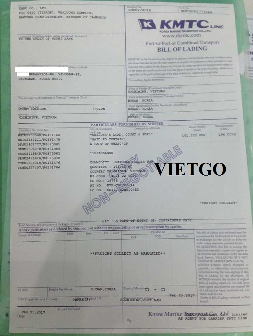 VIETGO xin gửi tới Quý vị vận đơn mặt hàng cao su mà bà Lim đã từng xuất khẩu sang Hàn Quốc