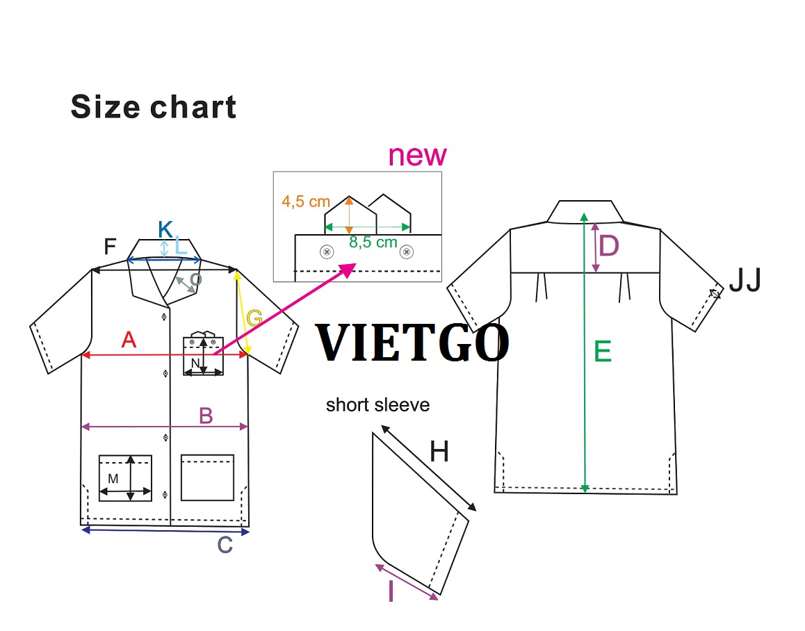 Thiết kế: Cổ chữ V, cộc tay, 2 túi, khuy bấm