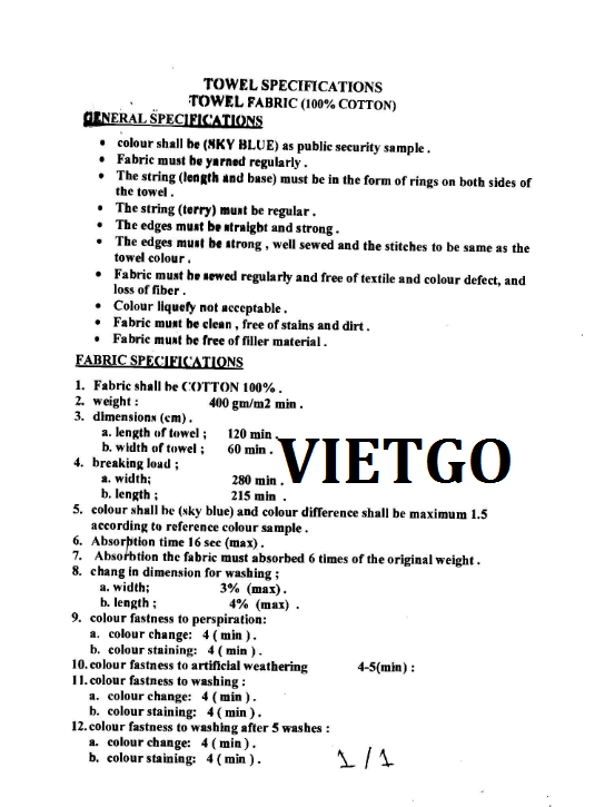 Chúng tôi đang cần mua 65.000 chiếc khăn bông với chi tiết và kích thước như ở dưới. Hình thức thanh toán là LC nhưng nếu quý vị có yêu cầu nào khác về điều kiện thanh toán, chúng ta có thể bàn bạc.