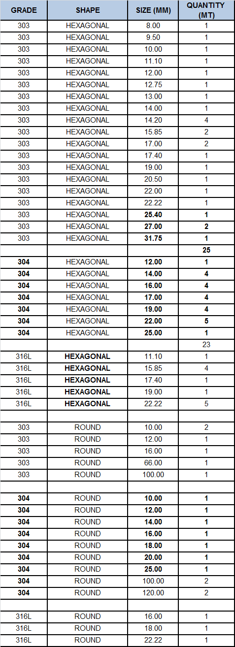 Ngoài ra chúng tôi còn quan tâm tới các các loại thép không gỉ quan trọng khác như thép hình tròn, lục giác và hình vuông với grade 303, 304L, 316, 316L, 310