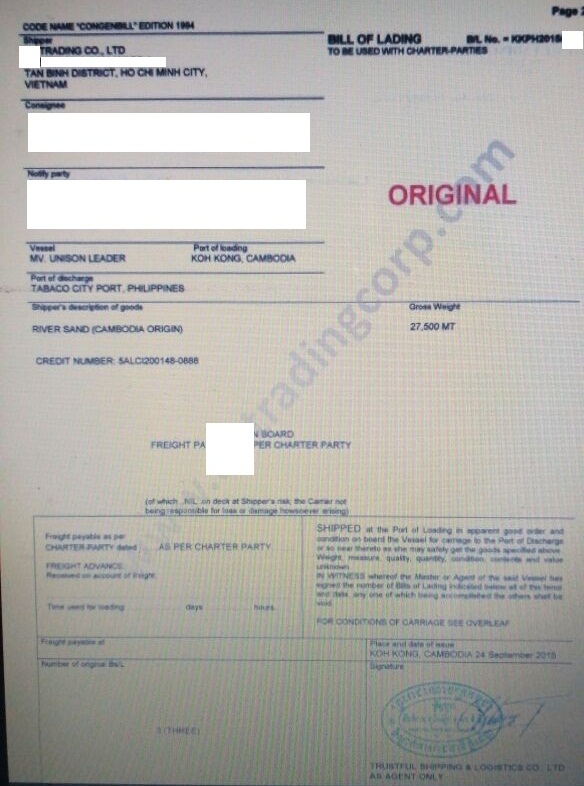 VIETGO xin gửi tới Quý vị Bill of lading và chứng chỉ SGS mặt hàng cát xây dựng mà Công ty ██████████g đã đại diện xuất khẩu thành công từ Campuchia sang Ấn Độ để Quý vị yên tâm Ông Arul là người đã có kinh nghiệm mua hàng