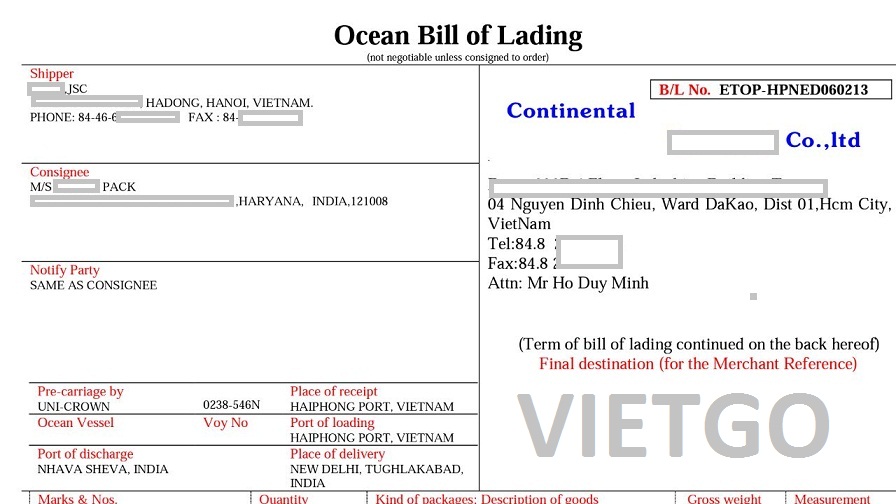 Hình ảnh vận đơn mà Công ty ██████████ Pack (ông Manish Yadav đại diện) nhập hàng từ một công ty tại Việt Nam