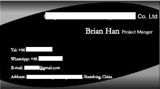 Công ty của ông Brian có trụ sở tại quận Shibei, tỉnh Shangdong, Trung Quốc. ██████████Co., Ltd. là một công ty chuyên về vật liệu xây dựng với sản phẩm chính là xi măng và clinker. Ông chia sẻ: “ Công ty chúng tôi đã cung cấp sản phẩm cho rất nhiều dự án lớn tại tỉnh Shandong. Chúng tôi thường xuyên nhập khẩu clinker nhưng lần này tôi muốn trực tiếp nhập khẩu xi măng. Công ty tôi thường bán khoảng 5000 tấn xi măng mỗi ngày. Đây là lần đầu tiên tôi nhập khẩu xi măng từ Việt Nam nên tôi hy vọng sẽ nhận được báo giá tốt để chúng ta có cơ hội hợp tác lâu dài”.