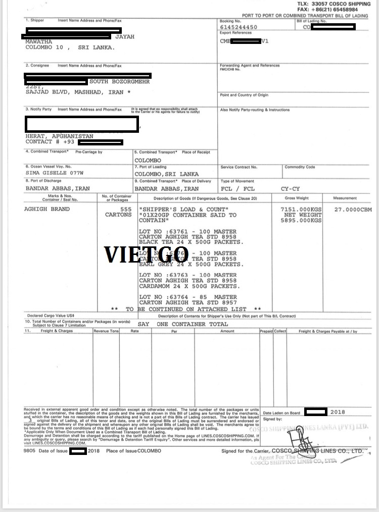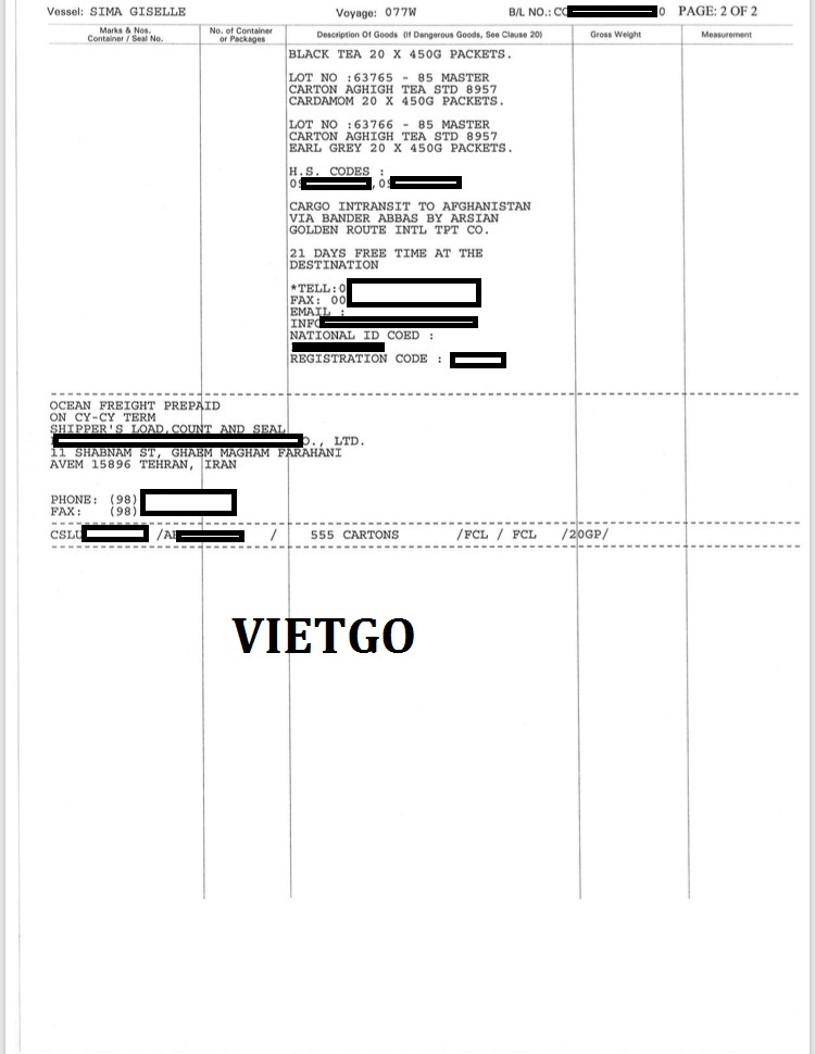Báo giá: FOB tại cảng Việt Nam và giá CIF cảng Banda Abbas, Iran.