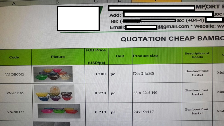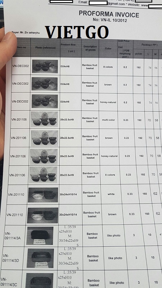 Từ những thương vụ trước của công ty, xin gửi tới quý doanh nghiệp Invoice nhập khẩu sản phẩm giỏ tre mà ông Ziv đã từng giao dịch trước đây tại Hà Nội, để quý vị có thể tin tưởng ông là vị khách tiềm năng và có nhiều kinh nghiệm. Ông Ziv cũng chia sẽ rất muốn hợp tác lâu dài với doanh nghiệp Việt Nam