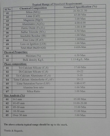 Yêu cầu: CaO 52% min// MgO 2% max// SiO2 2% max