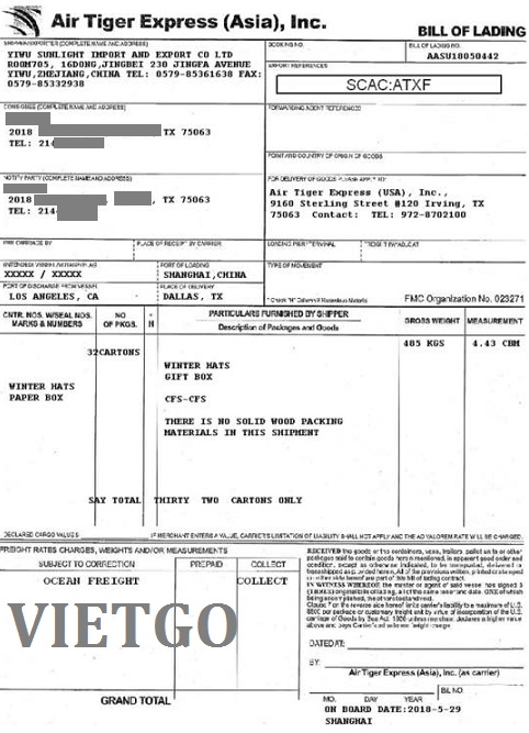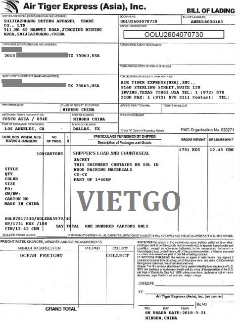 B/L nhập khẩu từ Trung Quốc trong chuyến hàng gần đây nhất của ông Mike Hong