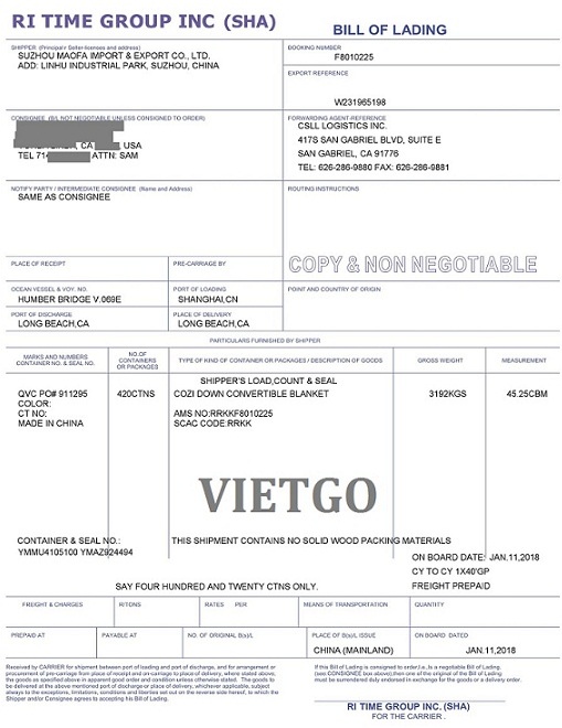 B/L nhập khẩu chăn bông từ Trung Quốc trong chuyến hàng gần đây nhất của ông Sam