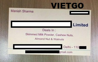 Ông Manish Sharma đại diện cho công ty ... đã liên hệ với VIETGO về đơn hàng hạt điều.