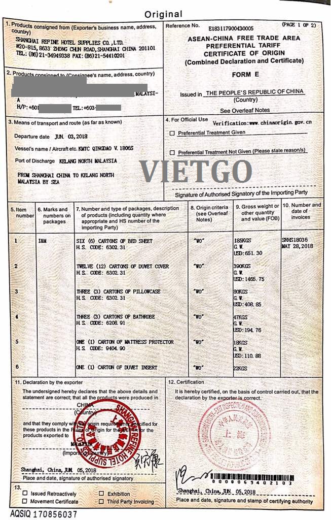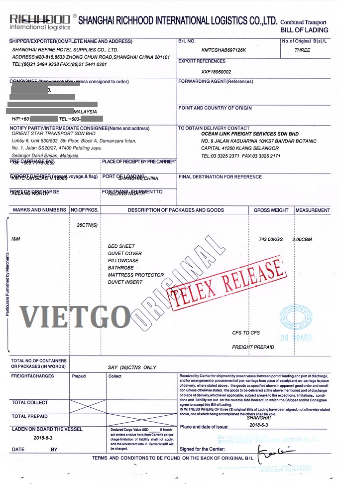 B/L nhập khẩu từ Trung Quốc trước đây của bà Intan