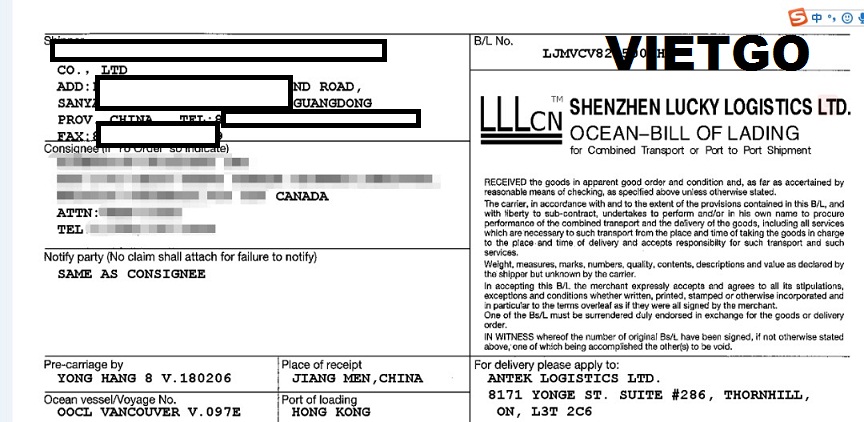 Hình ảnh B/L nhập khẩu bóng đèn led từ Canada