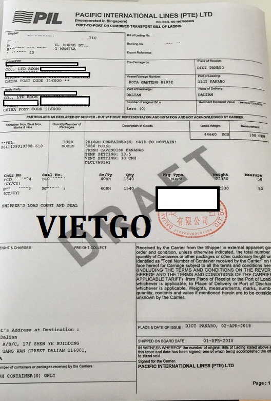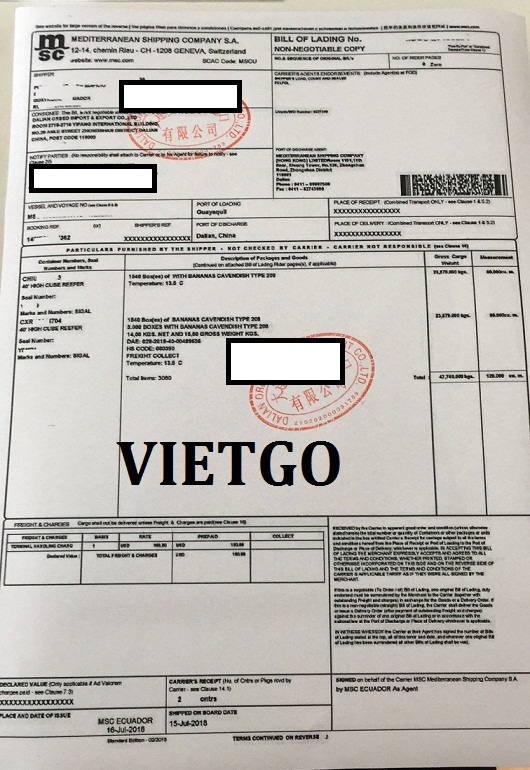 VIETGO xin gửi tới quý doanh nghiệp Vận Đơn (Bill of Lading) – Chứng từ nhập khẩu mà chỉ có doanh nghiệp đã từng giao dịch thành công mới có, để quý vị có thể tin tưởng bà là vị khách tiềm năng và có nhiều kinh nghiệm. Dưới đây là đơn hàng nhập khẩu chuối mà công ty của bà đã giao dịch thành công gần đây.