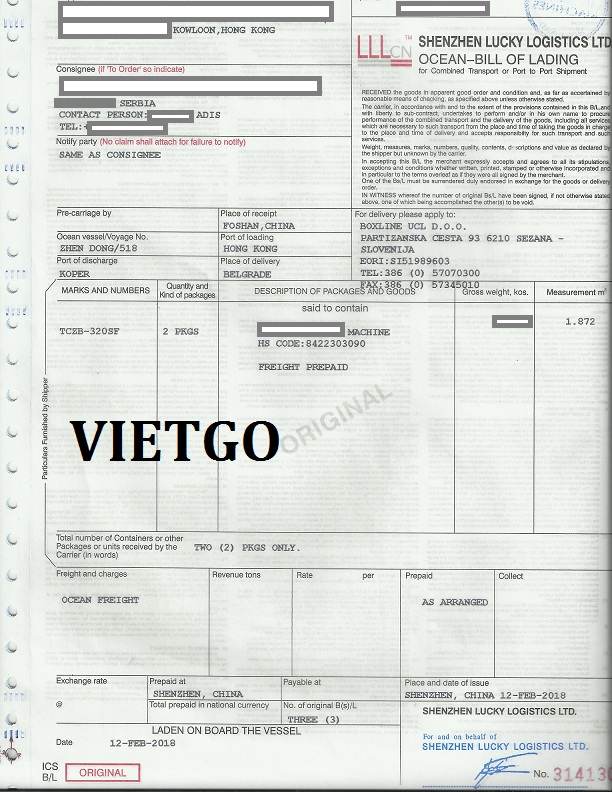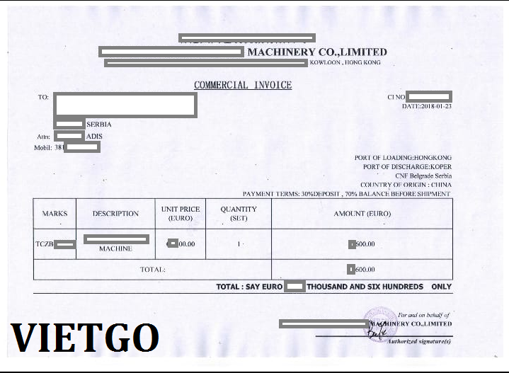 Bản B/L và Invoice nhập khẩu máy móc từ Trung Quốc được khách hàng chia sẻ với VIETGO