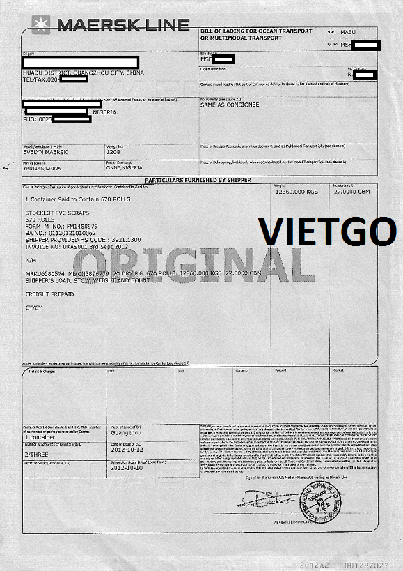 VIETGO xin gửi đến Qúy nhà cung bản vận đơn nhập khẩu đối với mặt hàng các sản phẩm phế liệu PVC từ Trung Quốc mà vị khách hàng gửi đến VIETGO, xác thực kinh nghiệm nhập khẩu cũng như thể hiện tinh thần nghiêm túc, nhiệt thành tìm đối tác là nhà cung cấp Việt Nam của vị khách hàng.