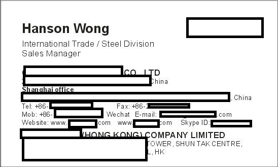 Ông Hanson đại diện đến từ công ty ██████████ Co., Ltd., có trụ sở tại Trung Quốc và chi nhánh văn phòng tại Hồng Kông. Công ty ông là công ty thương mại quốc tế chuyên xuất khẩu và nhập khẩu thép. Ông đã từng xuất khẩu thép sang Việt Nam.