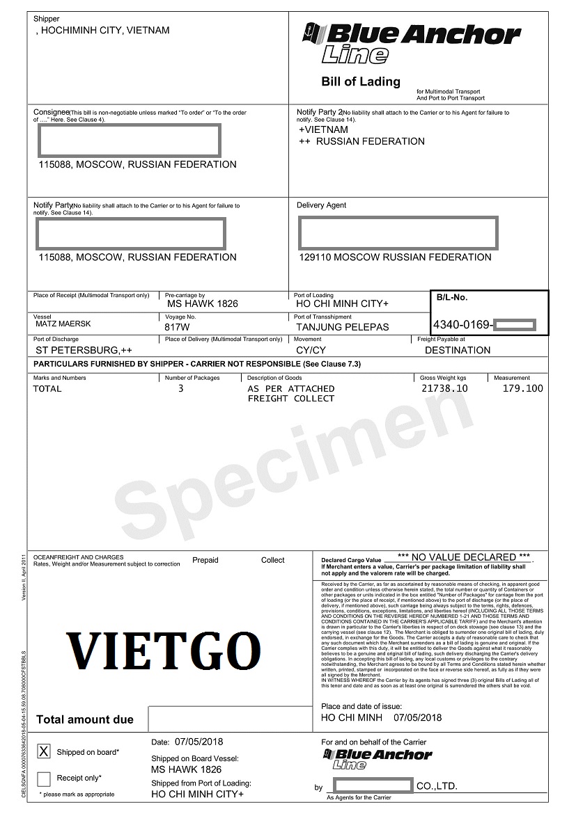 Ông Gleb còn gửi VIETGO bản Vận đơn (Bill of Landing) công ty ông nhập khẩu mặt hàng may mặc từ Thành phố Hồ Chí Minh tới Nga, vào đầu tháng 5 năm nay. Chúng tôi tin rằng qua bản Vận đơn này, Quý nhà cung cấp sẽ càng thêm tin tưởng vào vị khách này, rằng ông đã từng có nhiều kinh nghiệm trong việc nhập khẩu trước đây.