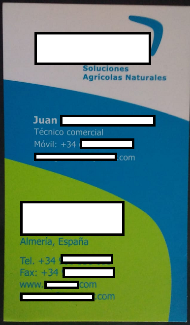 Qua cuộc trò chuyện ngắn với ông, được biết ông là Kỹ thuật viên thương mại của Công ty ██████████. Đây là doanh nghiệp chuyên về các mặt hàng nông sản như cà chua, các sản phẩm phân bón và xơ dừa để tạo ra sản phẩm phân bón. Công ty ông có trụ sở đặt tại Tây Ban Nha.