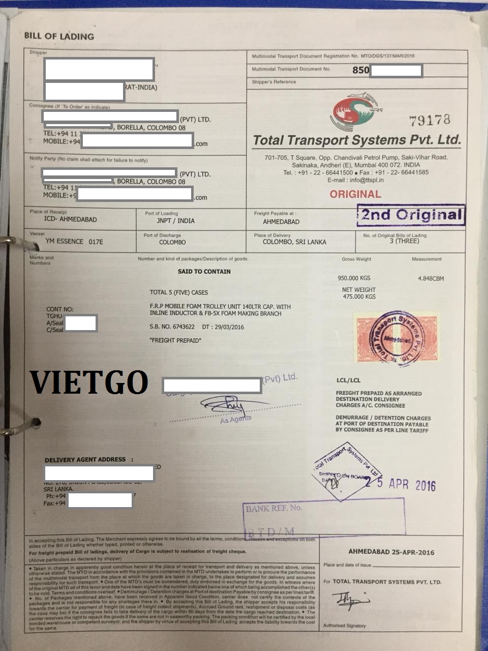 B/L nhập khẩu máy phun tạo bọt chống cháy từ Ấn Độ vào ngày 25/04/2016 của công ty ██████████