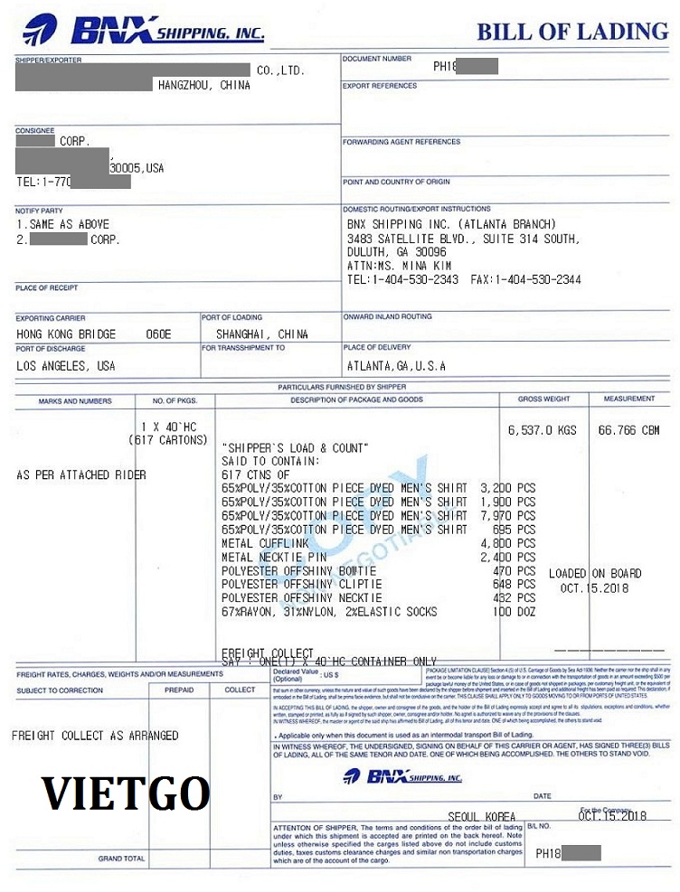 Bản B/L nhập khẩu áo sơ mi và một số mặt hàng khác của công ty ██████████ tại Mỹ, trung gian là công ty ██████████ Corp của ông Thomas Lee, từ Trung Quốc vào ngày 15/10/2018