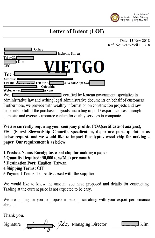 Ông Manuel đã gửi đến một THƯ HỎI HÀNG (LOI) chính thức để chứng minh rằng hiện tại Ông đang thực sự có nhu cầu mua hàng và Quý vị có thể hoàn toàn tin tưởng rằng vị khách này nghiêm túc trong việc hợp tác lâu dài với Quý vị.